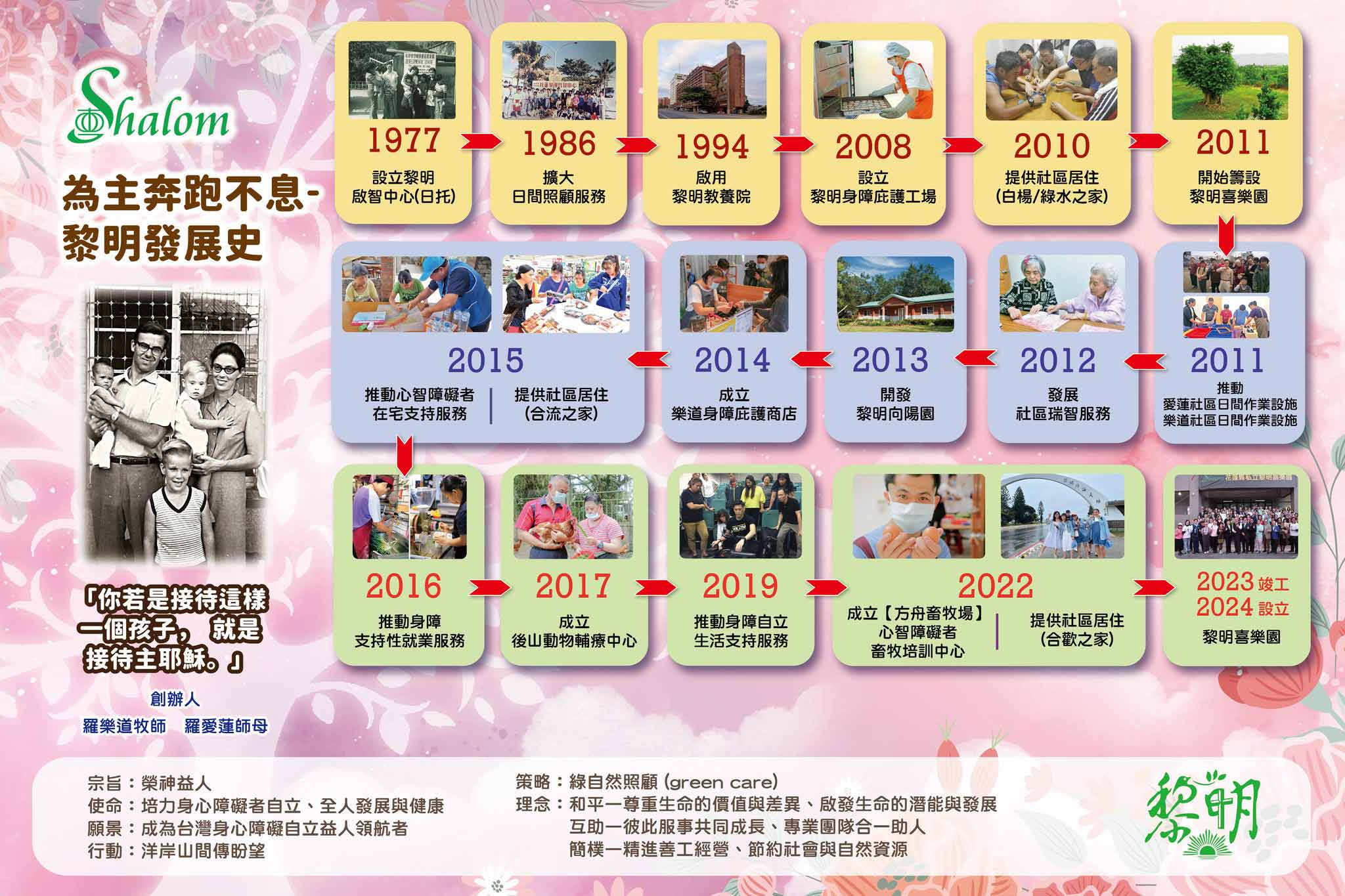 47年前,羅樂道牧師開著他的得利卡沿大街小巷,用熱情、耐心關懷家裡有身心障礙孩子的父母,希望他們讓孩子到「憨孩子的學校」學習。剛開始「黎明啟智中心」只有兩位教師和五、六位孩子,47年過去,黎明啟智中心成為黎明機構,並發展心智障礙者的整合性服務,服務據點除了黎明教養院之外,更增加了:社區服務的愛蓮日間作業設施、樂道日間作業設施、三個社區居住之家、綠自然照顧的黎明向陽園、輔導心智障礙者就業技能的黎明庇護工場及方舟畜牧場、服務自閉症者的黎明喜樂園,服務使用者與工作人員已超過400位。