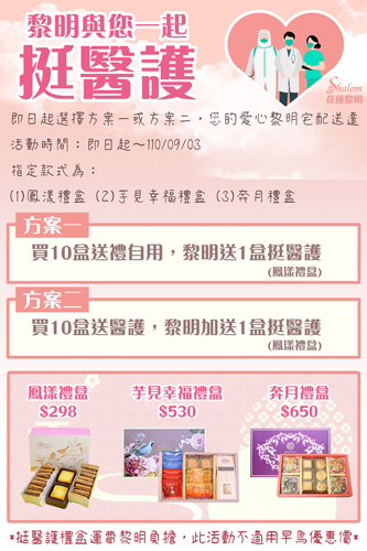 黎明庇護工場鍾京廷主任表示,配合防疫,工場採分流上班將近兩個月,但由於「中秋此檔節慶銷售是庇護工場營收的最大來源,除了平時的工作熟練度以外,節期時烘烤餅乾、包裝、組裝禮盒、封箱與出貨和日常工作稍有不同,這樣的訓練也會於三個月前就開始,我們能夠在這時刻仍順利推出中秋禮盒,要更感謝全台醫護人員持續守護台灣,因此推出「挺醫護」中秋禮盒公益方案,民眾只要購買10盒指定秋節禮盒自用或送醫護(鳳漾禮盒、芋見幸福禮盒、奔月禮盒),黎明會加碼致贈1盒鳳漾禮盒送醫護人員。
