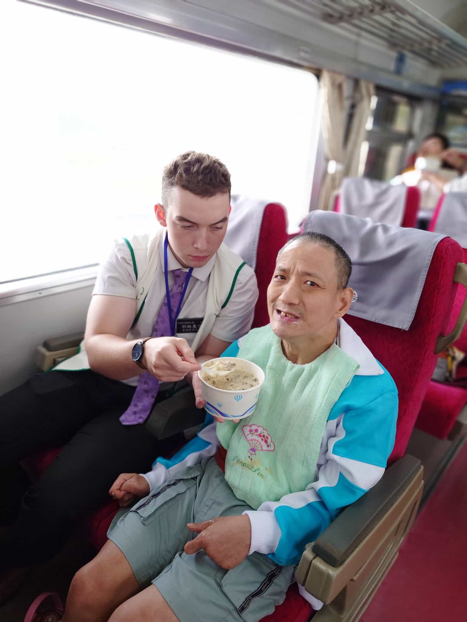 抵達瑞穗後,台鐵志工們溫柔陪伴,在轉車時協助調整座椅方向,讓服務使用者們原車返回花蓮市。過程中令人難忘的是,是一位志工抱著輪椅生小君移動時,因車身晃動,仍緊緊護著服務使用者。志工笑著說是自己「不夠力」,但這趟旅程中台鐵志工對大孩子的愛護和貼心,工作人員都看在眼裡。