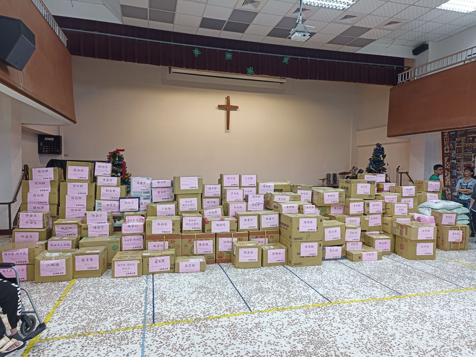 2023年12月8日,空間寬廣的黎明教養院五樓大禮堂,在這天堆滿了琳瑯滿目的物資。感謝蓮華觀音殿繼2022年末送暖後,看重花蓮心智障礙機構之需求,集結善男信女一行40人遠自宜蘭冬山鄉親臨本院捐款及運送物資。力挺黎明,減少本院及弱勢家庭之重擔。